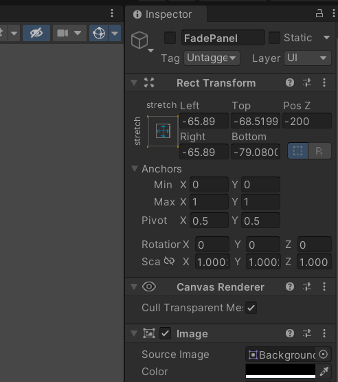 - Panel에는 위의 오브젝트 FadePanel을 넣었다. Panel에 직접 붙이지 않은 이유는 Panel을 활성화/비활성화하는 코드가 있기 때문이다. (-> Panel을 통해 전환 효과 중에 클릭을 막기 위해)