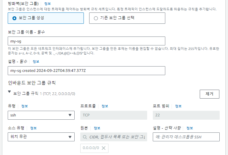EC2가 사용할 [방화벽(보안 그룹)]을 만들어줘야 한다. [보안 그룹 생성]을 클릭해서 새로 만들어준다.