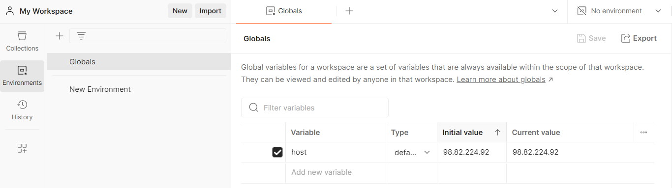 Environments > Globals에서 환경 변수를 만들자. 이름은 host로 하고 퍼블릭 IP를 담은 후 저장한다.