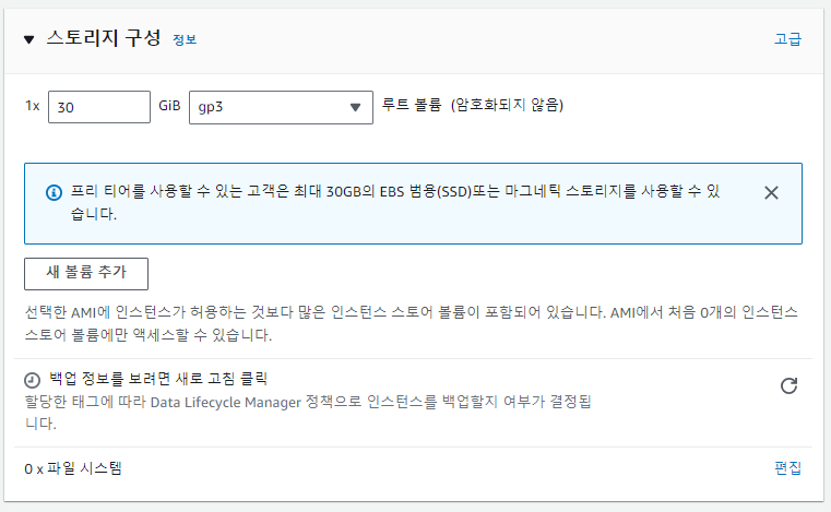 [스토리지 구성]에서 볼륨 용량을 선택한다. 프리 티어로 30GiB까지 지원해주므로 30을 입력했다.