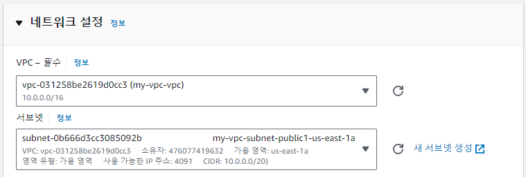 이제 스크롤을 내려 [네트워크 설정]을 보면 VPC, 서브넷이라는 항목이 있다.