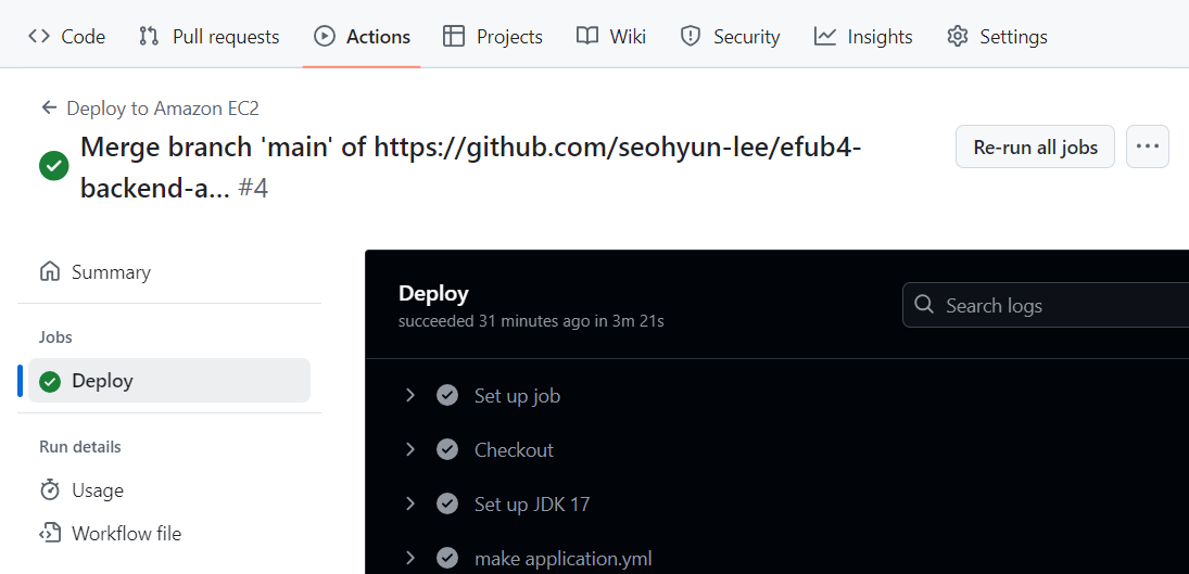 워크플로우 진행상황을 보며 기다리니 배포에 성공했다.
