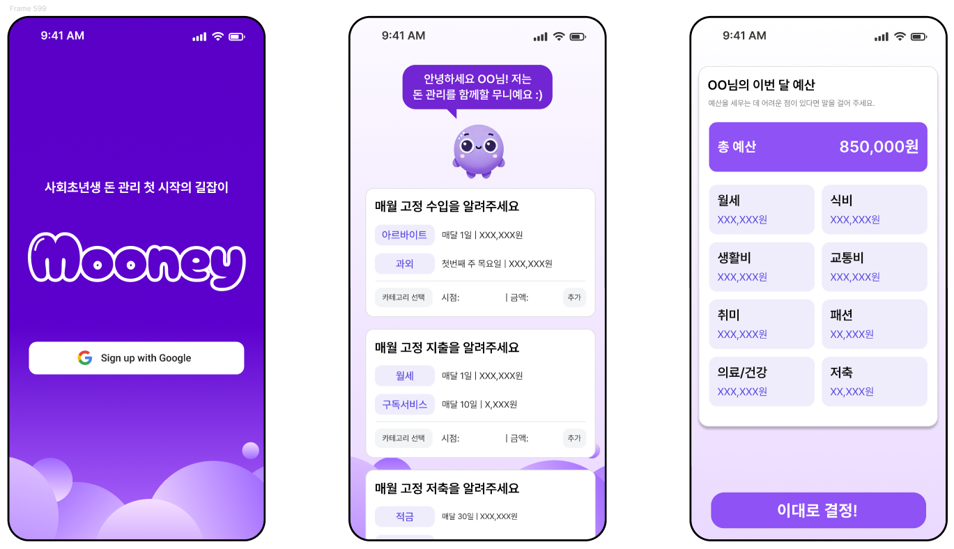 Mooney(무니)는 개인 일정 및 소비 특성 기반 밀착 관리 가계부 서비스로, 예산 설정과 지출 관리에 어려움을 겪는 사회 초년생을 타깃으로 합니다.
