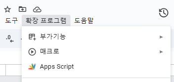 스프레드시트를 생성해서 열고 상단 메뉴바에서 확장 프로그램 > Apps Script를 클릭한다.