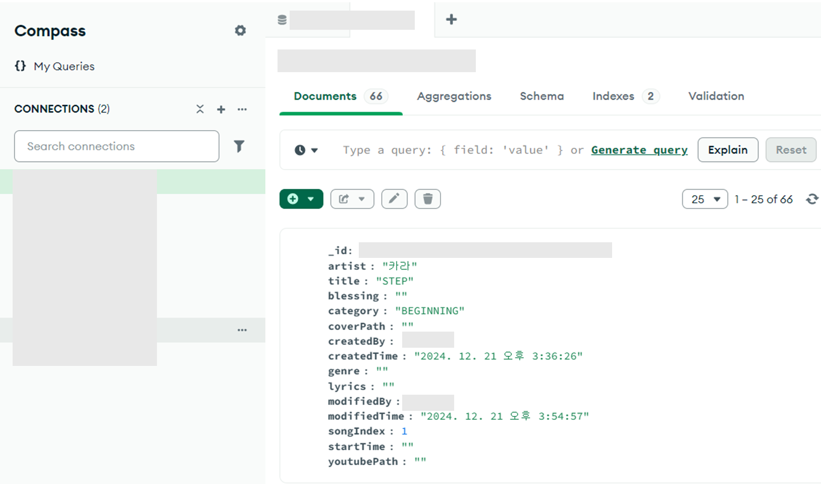 MongoDB Compass에 연결해서 데이터가 잘 삽입된 것을 확인하자.