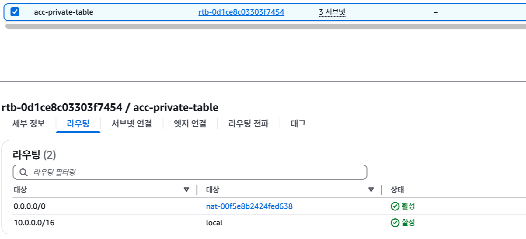 private용 라우팅 테이블을 만들어 private subnet들을 연결하고, 라우팅에 NAT Gateway를 추가한다. (대상: 0.0.0.0/0)