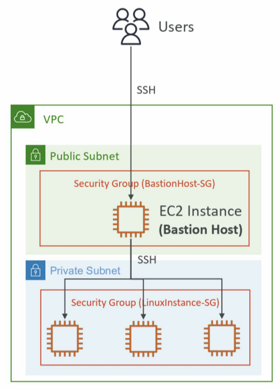 - Bastion Host(public EC2)에서 private EC2 여러개에 접근할 수 있는 방식. (SSH와 Security Group을 이용)