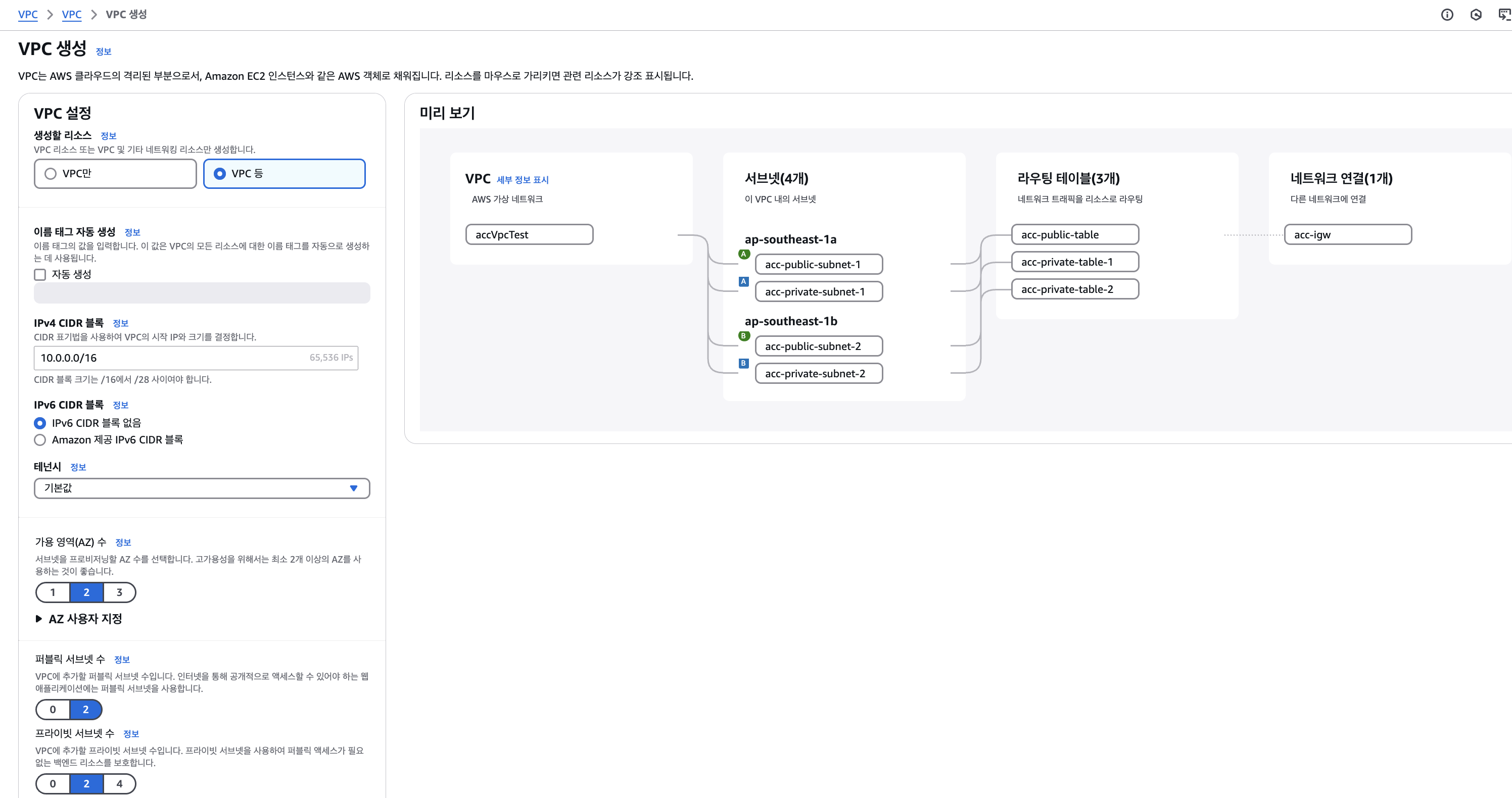 VPC와 서브넷들을 한 번에 만들 수도 있고, VPC만을 생성한 뒤 subnet들을 개별적으로 생성할 수도 있다.