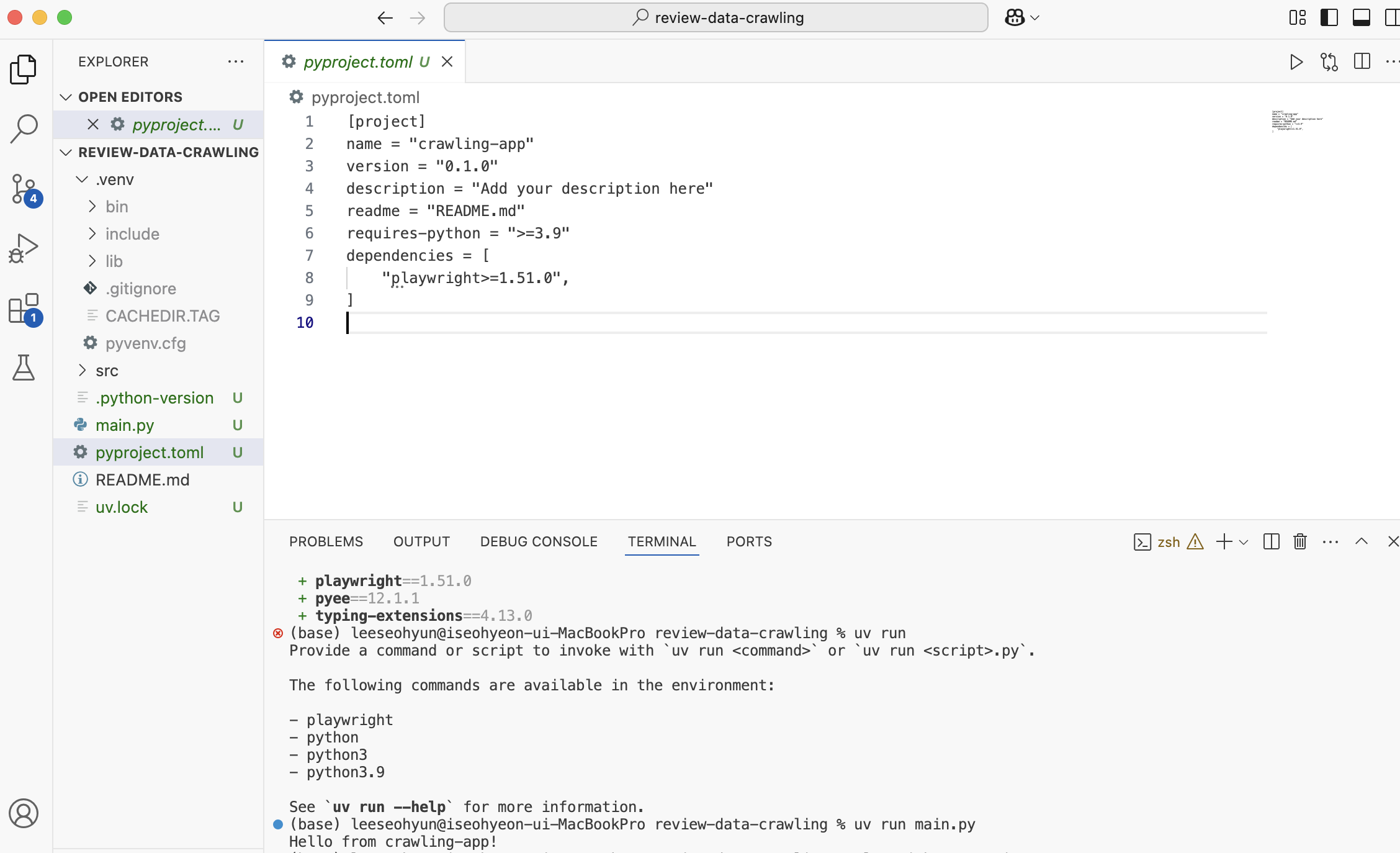 실행하면 .venv는 자동으로 생긴다. 이제 실행할 때 pip + venv 쓸 때처럼 번거롭게 activate 작성하지 않아도 된다!