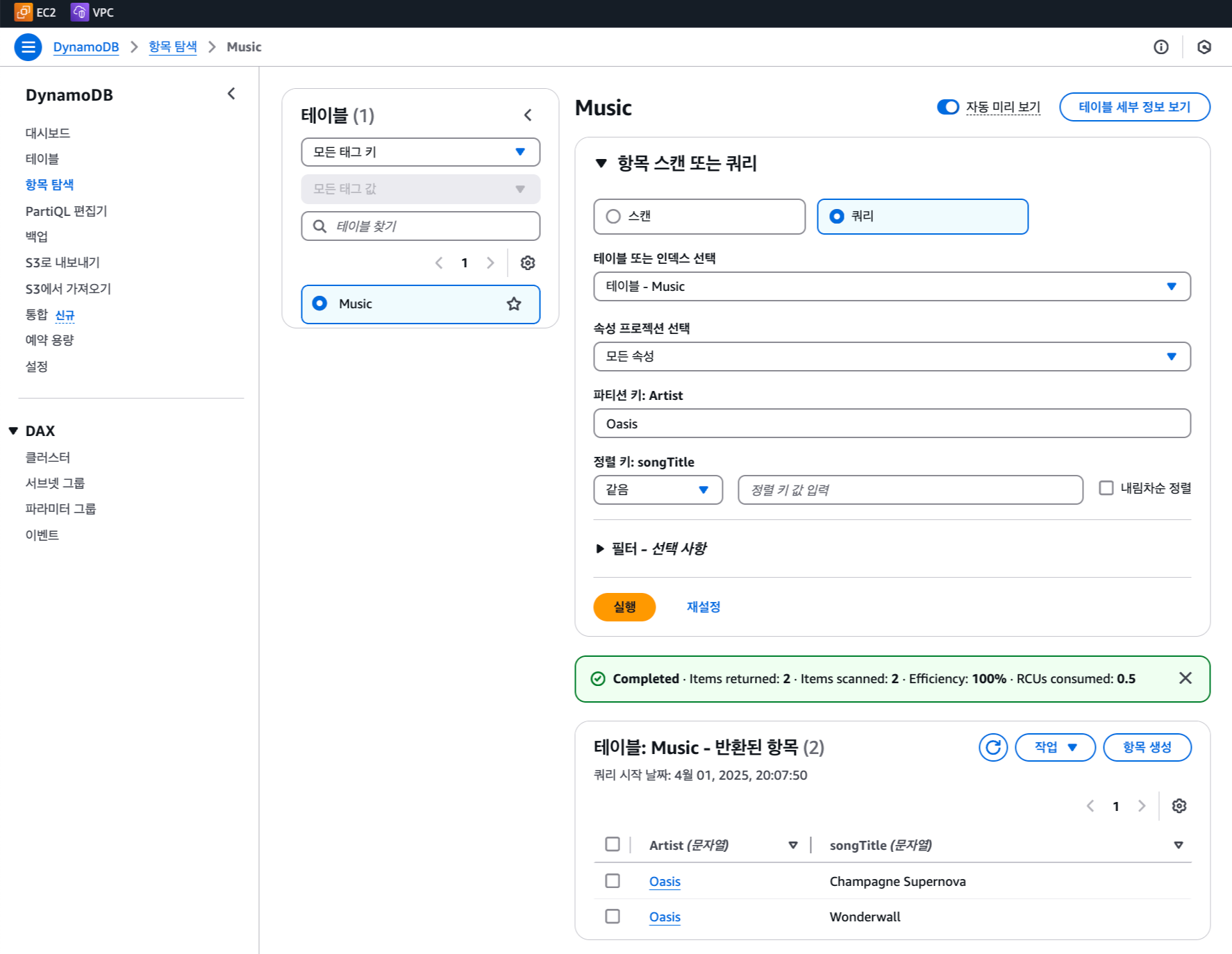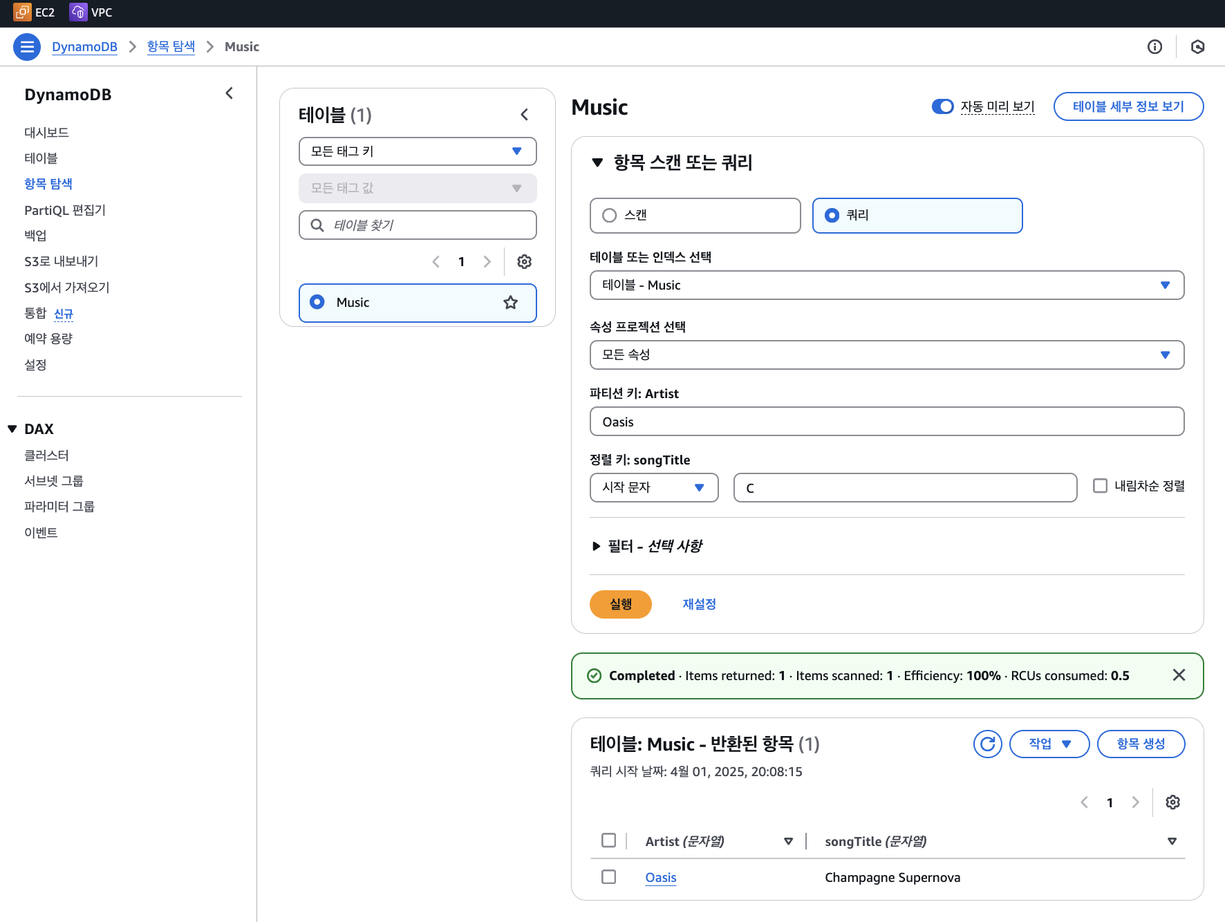 파티션 키 Artist의 값이 Oasis인 것 중, 정렬 키 songTitle의 값이 C로 시작하는 항목인, Oasis의 Champagne Supernova가 나왔다!