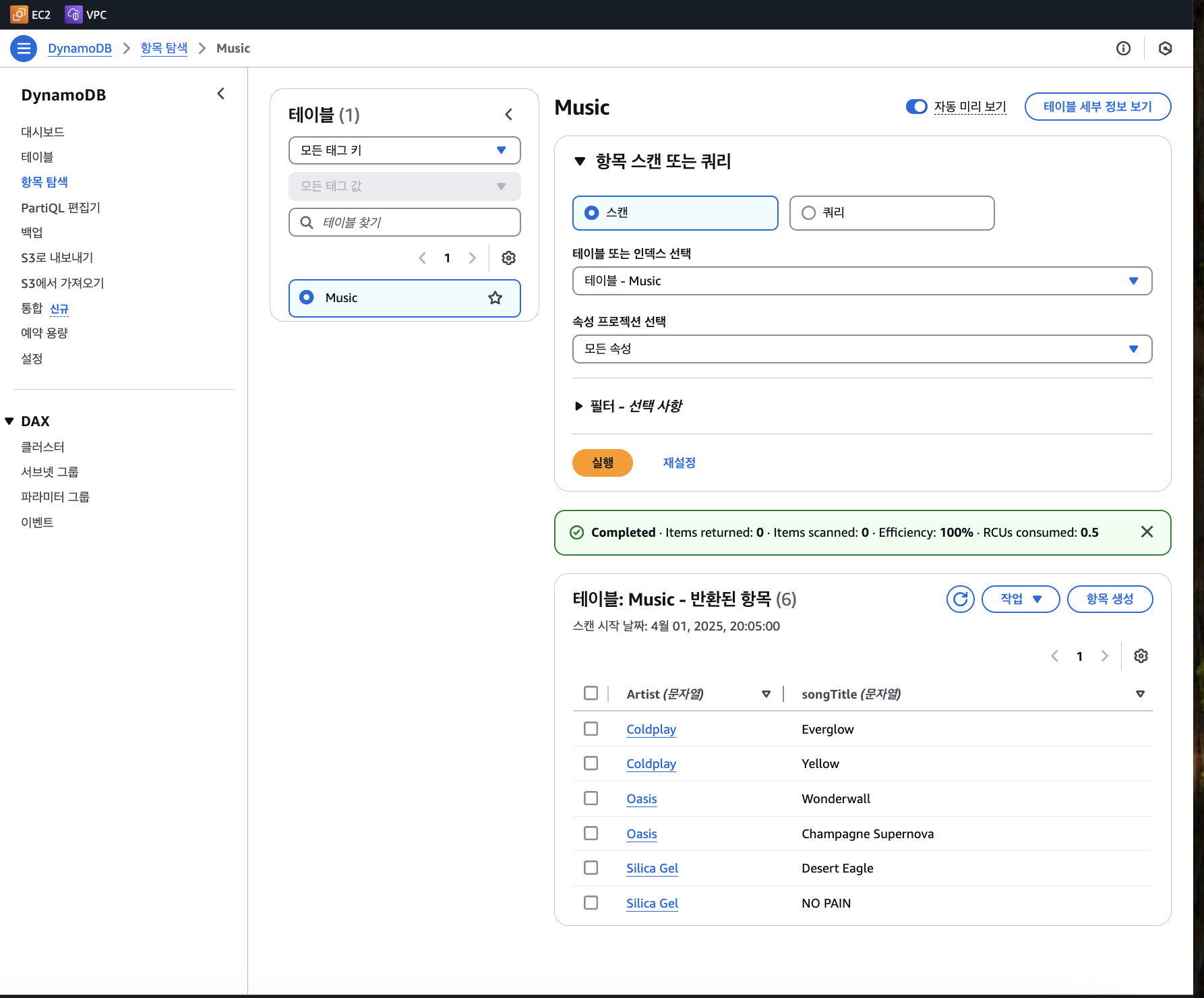 항목 탐색에서 항목(데이터)에 좋아하는 노래들을 이렇게 6곡 추가해 보았다.