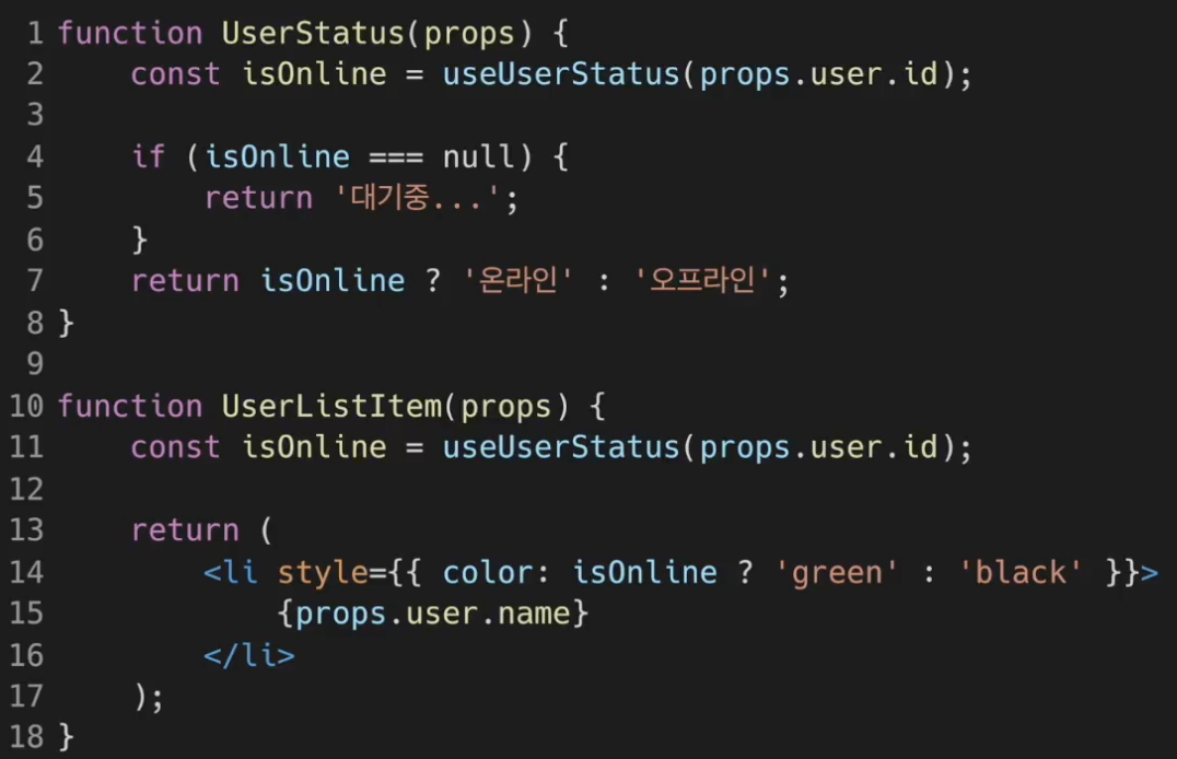 - 단순 함수와 같은데 이름이 use와 같고, 위의 Hook의 규칙이 적용됨. 파라미터 등은 자유