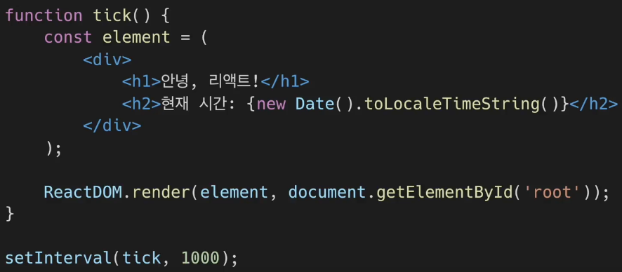 - 컴포넌트는 계속 존재하는 것이 아니라 시간이 흐름에 따라 생성되고 업데이트되다가 사라진다.