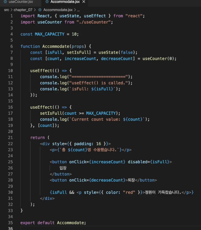 - 소스 코드 통해 모든 로직 명확히 확인 가능해야. (일반적인 자바스크립트 함수에서 Hook 호출하면 안 됨. 리액트 함수 컴포넌트에서 호출하거나 직접 만든 커스텀 훅에서 호출해야 한다.