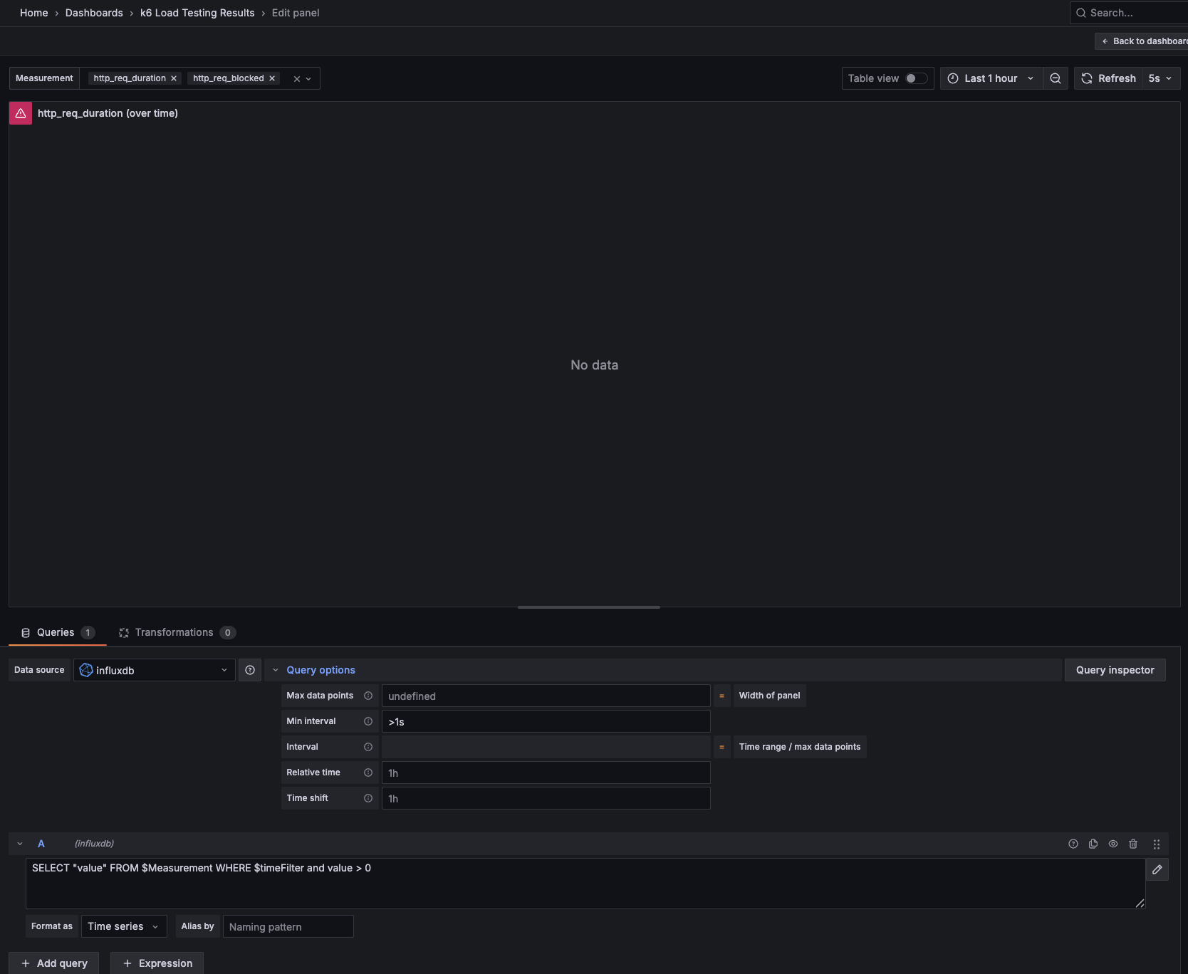 Grafana를 보니 시각화 패널들에 No data 문구와 함께 핑크색 경고 표시가 떠서 의아했는데