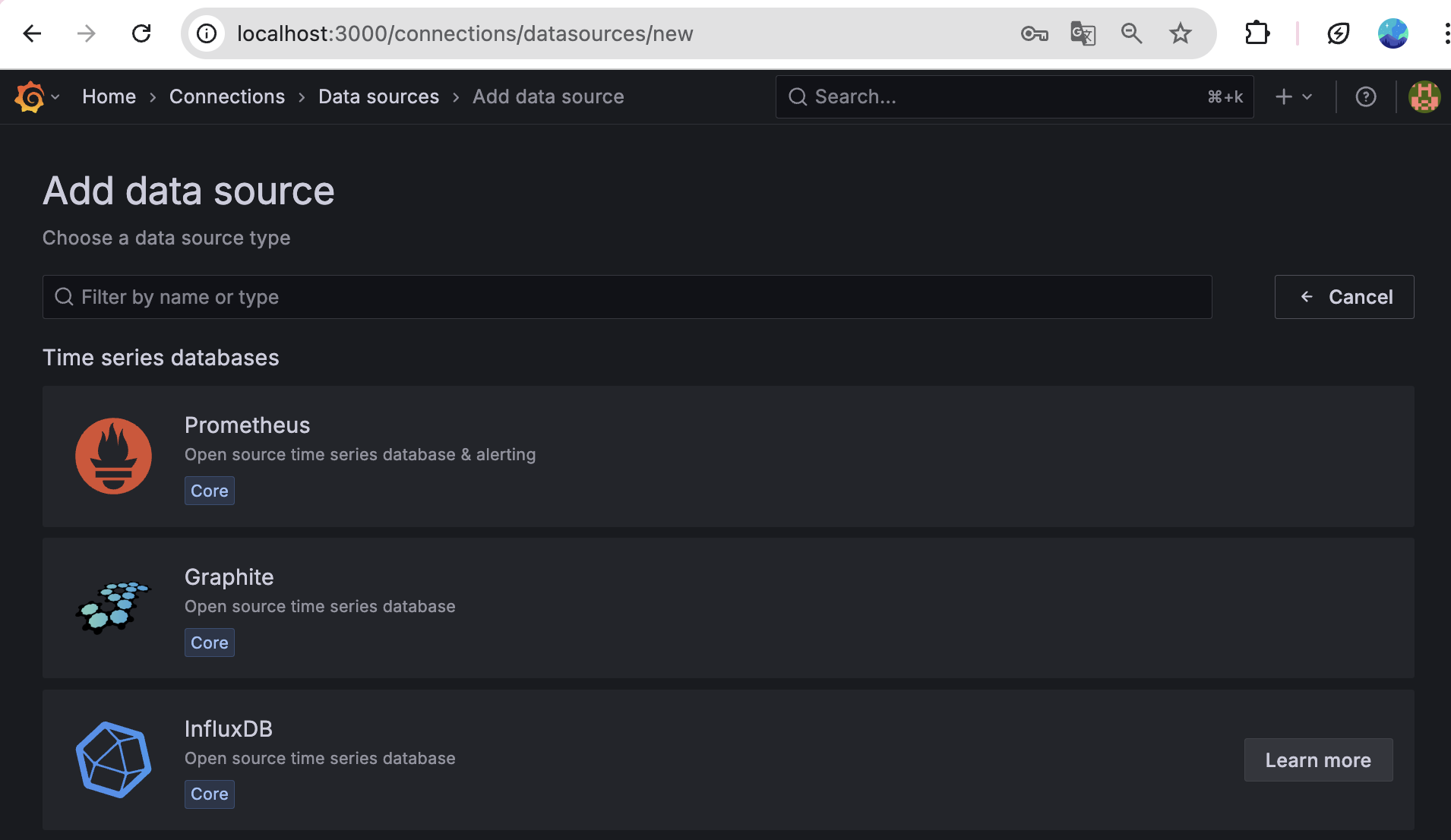 로그인을 완료하고 Connections > Data sources > Add data source에서 InfluxDB를 선택