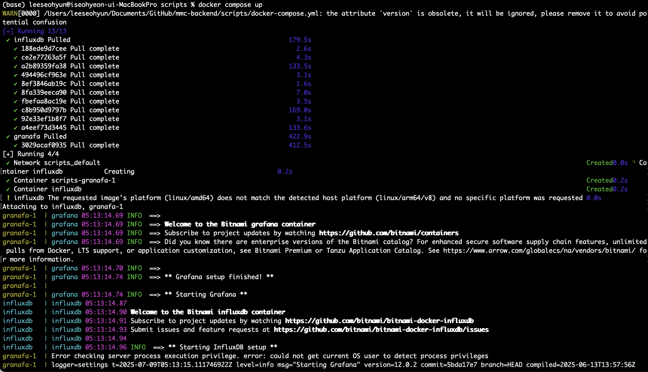 docker-compose.yml을 작성한 뒤 docker compose up으로 influxdb와 grafana 각각의 이미지를 받아 컨테이너를 올렸다.