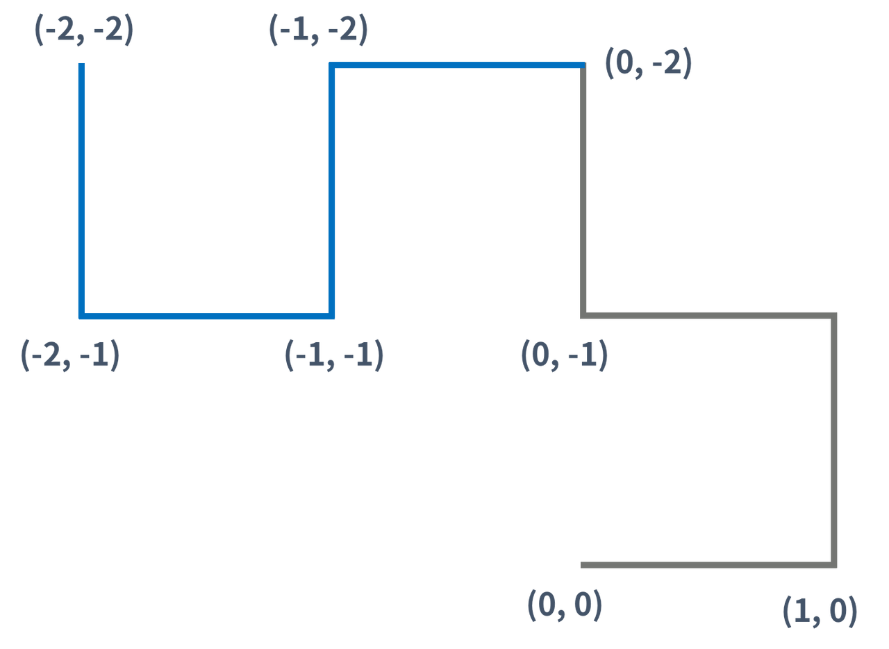 즉, K(K > 1)세대 드래곤 커브는 K-1세대 드래곤 커브를 끝 점을 기준으로 90도 시계 방향 회전 시킨 다음, 그것을 끝 점에 붙인 것이다.