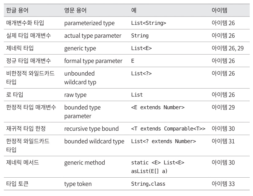 - 로 타입(raw type): 타입 매개변수를 전혀 사용하지 않을 때를 의미 (ex. List, Collection)