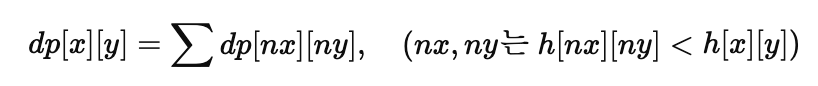 따라서 DFS를 사용해 시작 지점인 (0, 0)부터 내려가면서, 낮은 칸 dp를 먼저 계산하고 올라오면서 현재 보고 있는 칸 dp[x][y]를 채워야 한다.