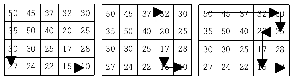 현재 제일 왼쪽 위 칸이 나타내는 지점에 있는 세준이는 제일 오른쪽 아래 칸이 나타내는 지점으로 가려고 한다. 그런데 가능한 힘을 적게 들이고 싶어 항상 높이가 더 낮은 지점으로만 이동하여 목표 지점까지 가고자 한다. 위와 같은 지도에서는 다음과 같은 세 가지 경로가 가능하다.