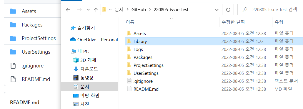 "내 컴퓨터에서 문서\GitHub\(레포지토리이름) 폴더에서 기존 .gitignore, README.md는 그대로 놔두고 Assets 등 프로젝트 내부 폴더 넣고 커밋&푸시"