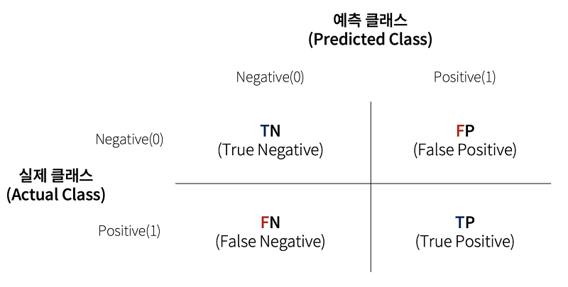 그러면 예측 클래스와 실제 클래스 값 유형에 따라 TN, FP, FN, TP 로 오차 행렬 4분면 채울 수 있음