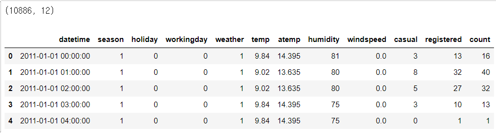 -> 10886개의 레코드, 12개의 칼럼으로 구성되어 있다.