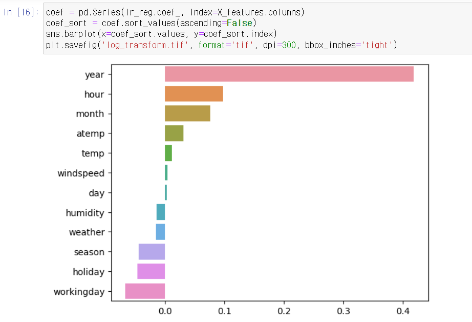 -> 원-핫 인코딩 후 - 여전히 year 관련 피처들의 회귀계수 값이 가장 높지만 season관련, weather 관련 속성들의 회귀 계수값도 상대적으로 커졌다.