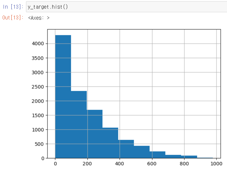 회귀에서 이렇게 큰 예측 오류가 발생할 경우 가장 먼저 살펴볼 것은: Target 값의 분포가 왜곡된 형태를 이루고 있는지 확인하는 것! Target 값의 분포는 정규 분포가 가장 좋고, 그렇지 않고 왜곡된 경우엔 회귀 예측 성능이 저하되는 경우가 발생하기 쉽다.