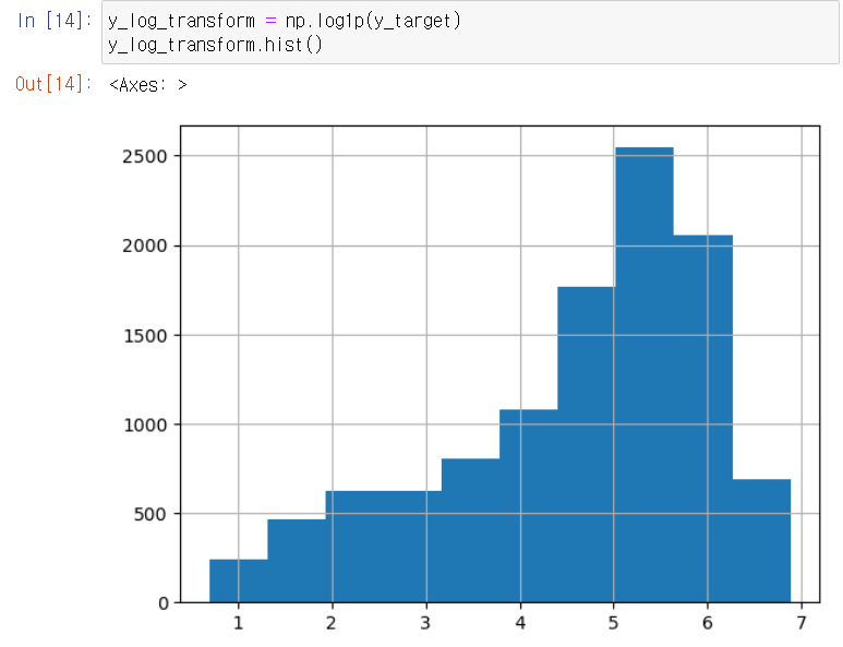 로그를 적용해 변환하면 정규분포 형태로 바꿀 수 있다. 넘파이의 log1p()를 이용해 변경하자.