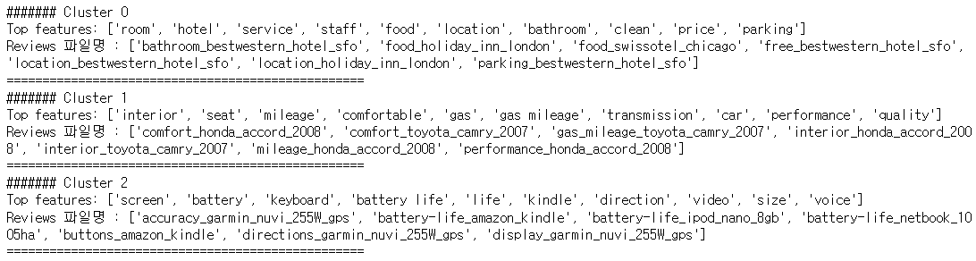 # cluster_centers_.argsort()[:,::-1] 로 구한 index 를 이용하여 top n 피처 단어를 구함.