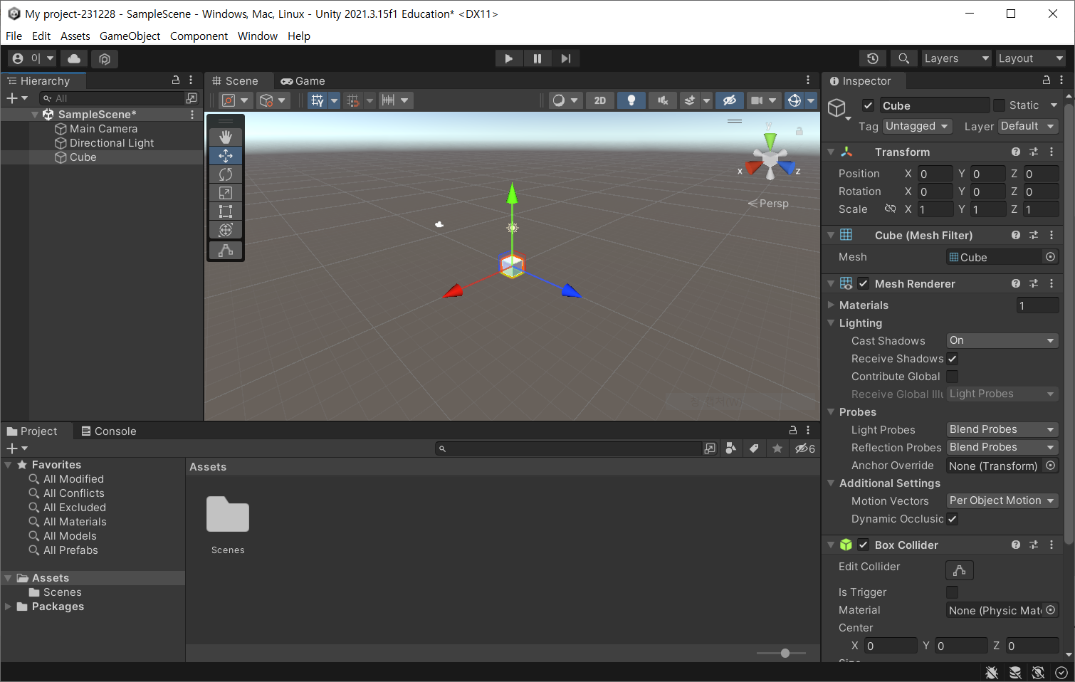 - Transform 컴포넌트 : 3D 공간에서의 위치를 결정한다. Position 값을 수정하면 오브젝트 위치를 옮길 수 있다.