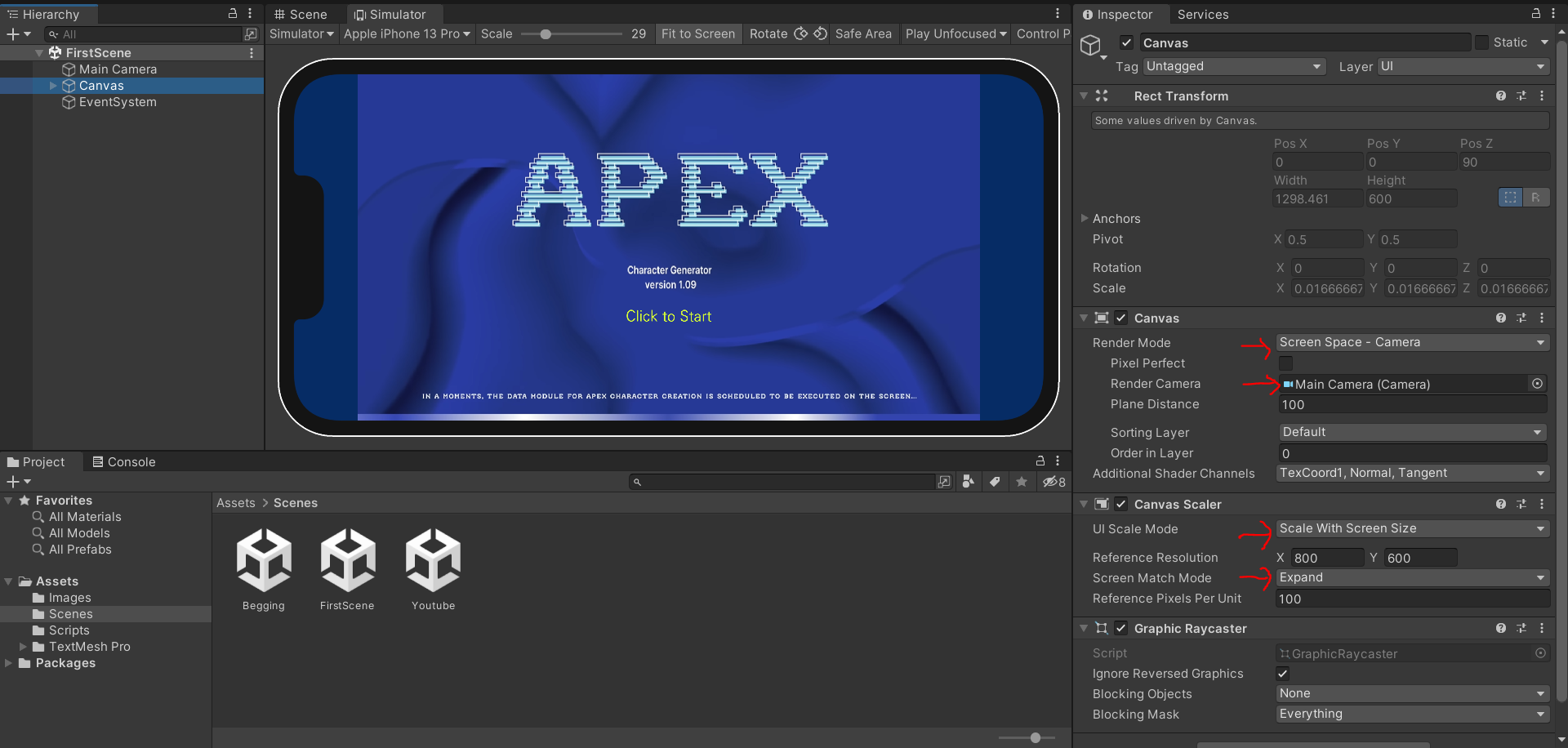 캔버스의 EventSystem에 SceneController.cs를 달아준 후 targetScene 필드를 통해 ChangeScene()이 호출되었을 때 이동할 씬을 입력했다. Button의 On Click에서 (EventSystem의 해당 스크립트의) ChangeScene()을 호출했다.